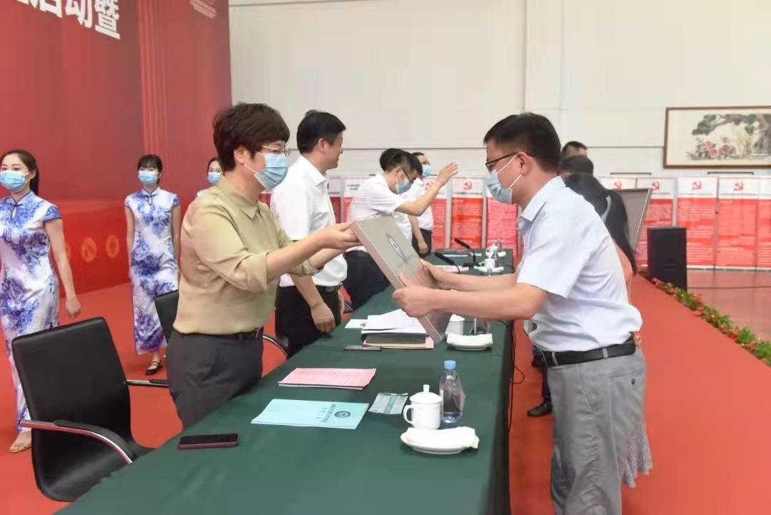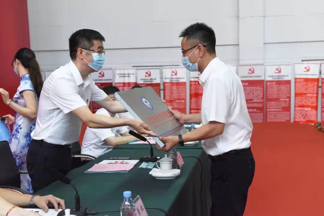 吳勇、徐進(jìn)、葉蕭紅、施正森、蔣慧兒分別向杭州電化集團(tuán)有限公司、浙江巴陵恒逸己內(nèi)酰胺有限公司、浙江鼎龍科技股份有限公司、杭州海潮橡膠有限公司、杭州吉華江東化工有限公司五家企業(yè)授“應(yīng)急先鋒黨建聯(lián)盟成員單位”銘牌。
